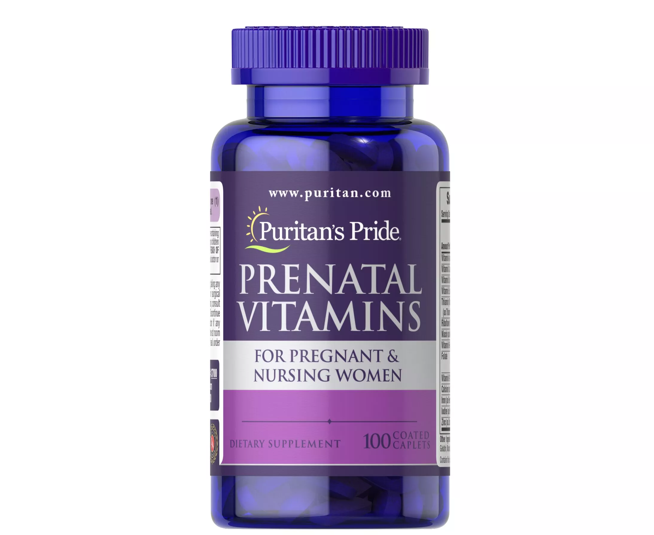 This supplement is an excellent source of some of the nutrients you may need during pregnancy and lactation.** Specially formulated to meet the unique nutritional needs of prenatal and postnatal women, this daily multivitamin contains 800 mcg of Folic Acid. Folic Acid is important to expectant women because healthful diets with adequate folate may reduce a woman’s risk of having a child with a brain or spinal cord birth defect. Puritan's Pride Prenatal Vitamin formula is a good source of Calcium, one of the most important minerals in your body, and a good source of Vitamin D, which assists in the absorption of Calcium.** In addition, these prenatal vitamins contain Iron, a vital component of hemoglobin that plays a key role in energy metabolism.** Because Iodine is essential for the normal prenatal development of the baby, there is 150 mcg of Potassium Iodine per serving.