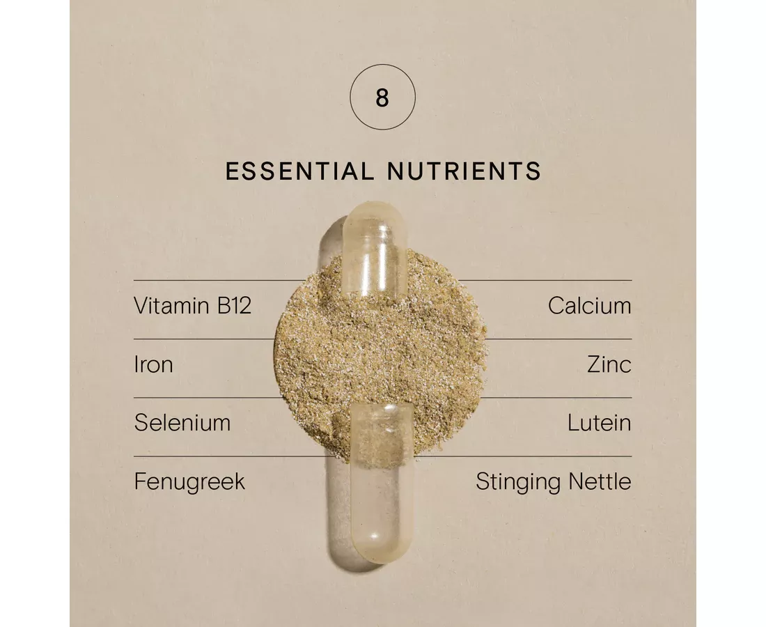 Lithothamnium Calcareum providing Calcium, Organic Fenugreek powder, Mineral enhanced yeast providing Iron, Mineral enhanced Lactobacillus bulgaricus providing Zinc, Organic Stinging Nettle Leaf, Marigold extract providing Lutein, Vitamin enhanced yeast providing Selenium and Vitamin B12, vegetable cellulose (capsule shell)."