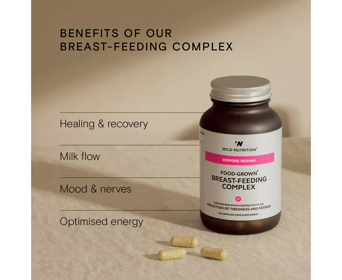 Wild Nutrition Food Grown pregnancy and fertility support continues into breastfeeding. Our breastfeeding complex includes Lutein, Vitamin B12, which contributes to the normal functioning of the nervous system and iron, selenium and zinc which contribute to the reduction of fatigue as well as the health of skin, hair and nails. Recent research has shown that supplementation with lutein during breastfeeding can enhance essential supply to the breastfed baby. You can buy Wild Nutrition Food Grown range of capsules here."